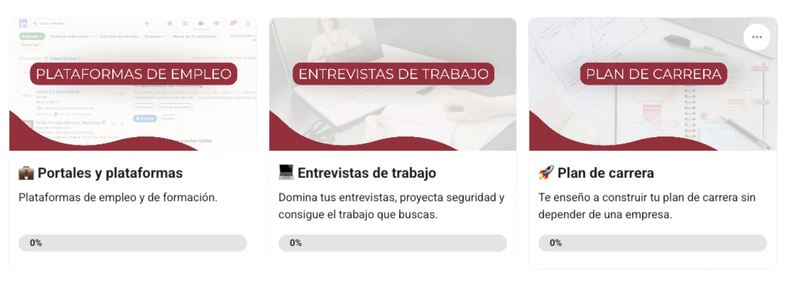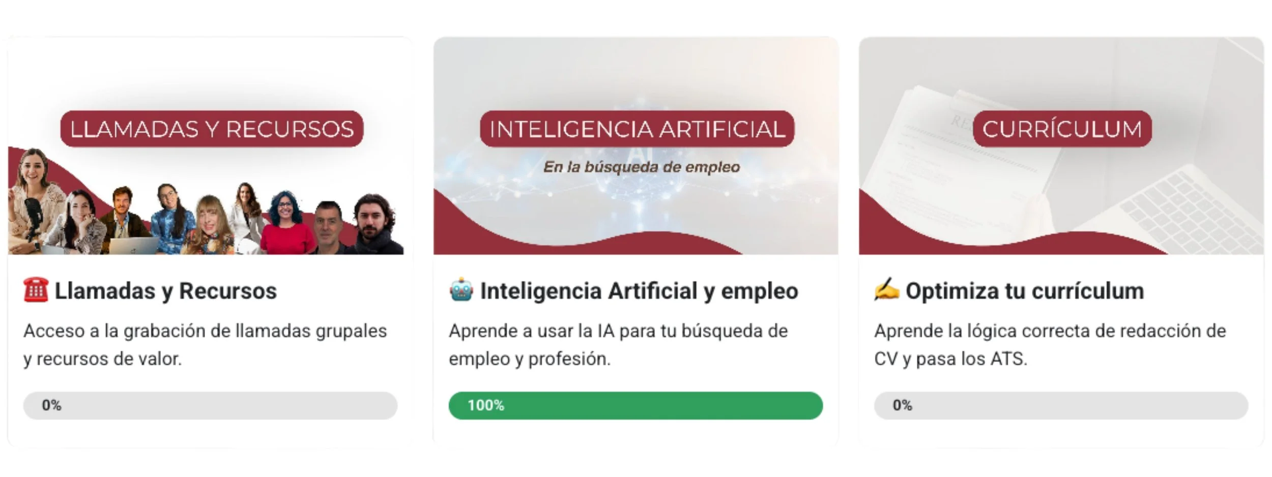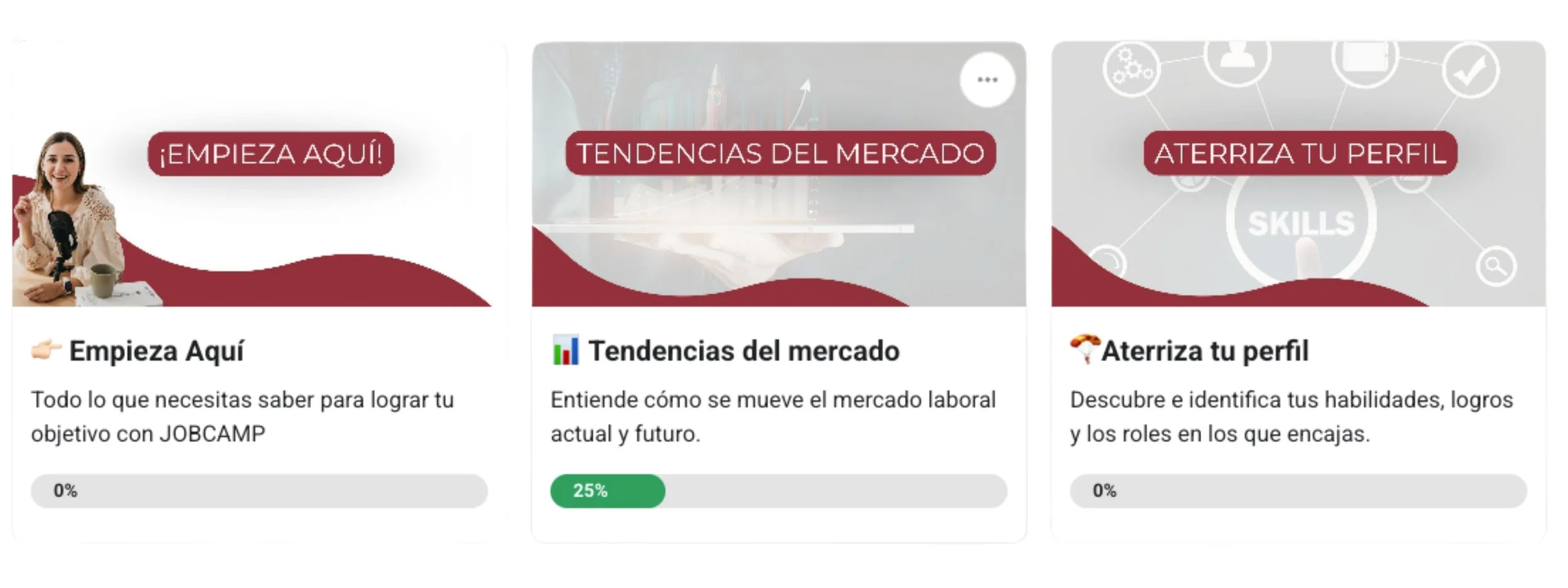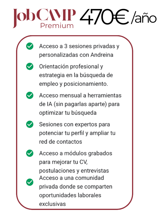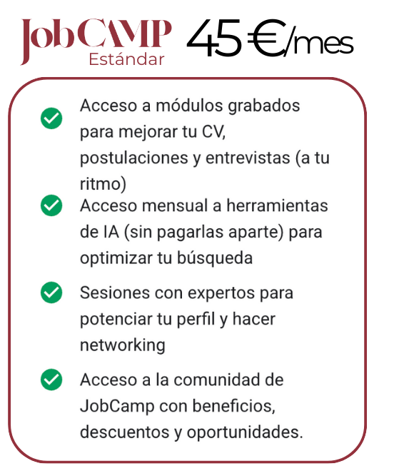 JobCamp sin sesiones 1:1, te da acceso al espacio completo: método, recursos y plantillas para avanzar a tu ritmo y con autonomía.